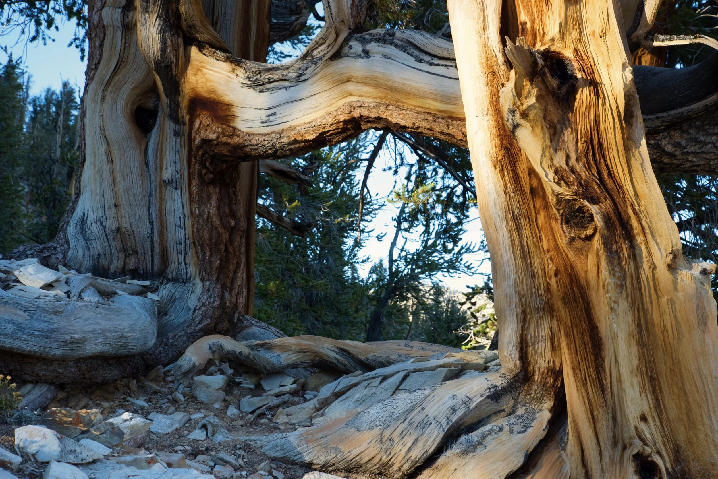 While we were hiking, we speculated a lot about which tree Methuselah might be, but there were no obvious contenders. Just hundreds of beautiful trees. Many of the trees have dead branches and portions of trunk where the bark has sheered off, leaving behind colorfully twisted wood.