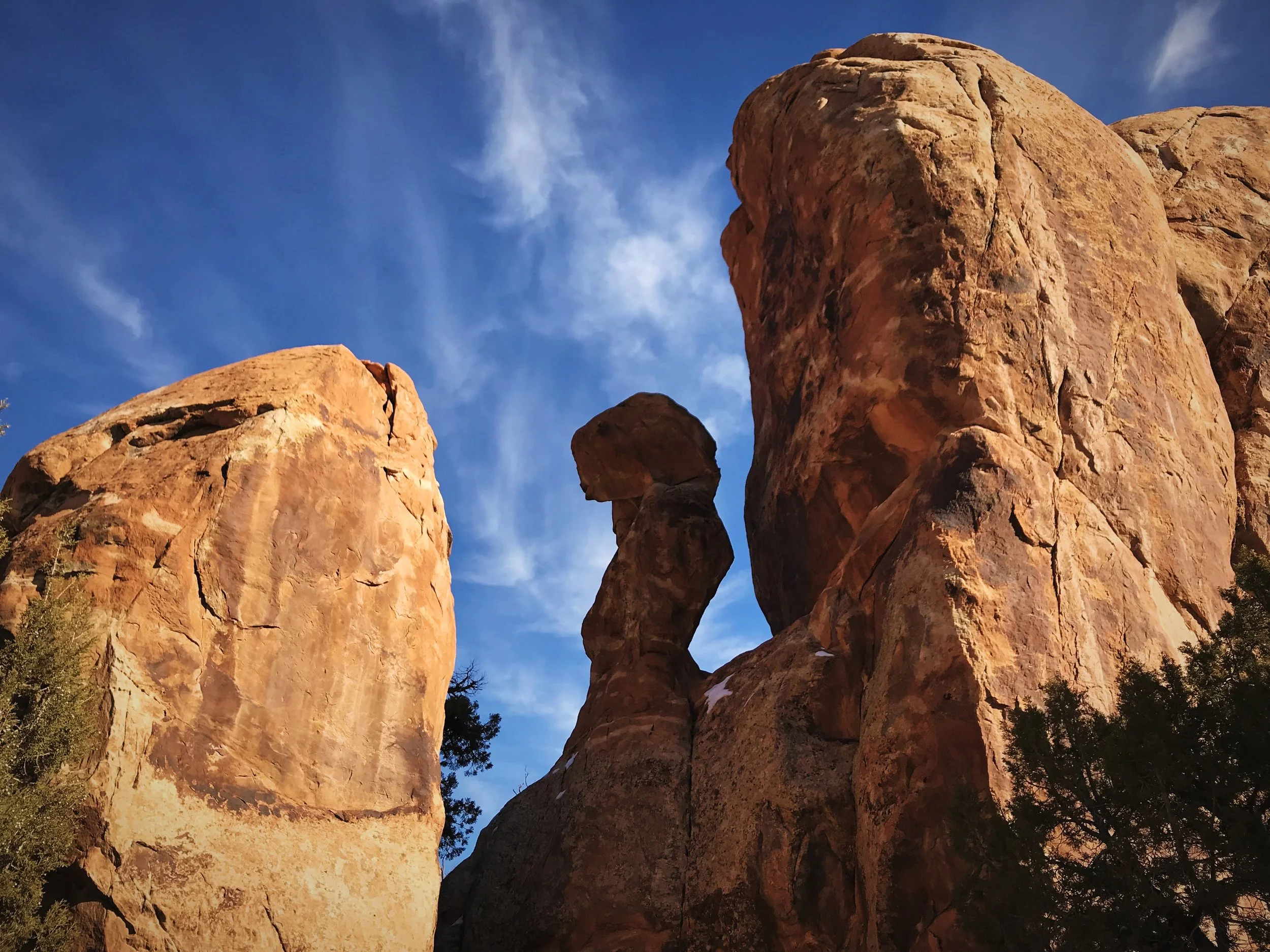 On our way to next the stop, which was at the end of a half mile spur trail, we got quite far off the trail in an area of sand and juniper brush due to deep snow obscuring the trail. At the end of this spur trail is a sandstone formation called Dark Angel. Prior to this hike, we had no idea what the Dark Angel formation would look like. We just saw the trail marked with the evocative name “Dark Angel,” and we knew that we had to check it out. The Dark Angel turned out to be a tall, narrow obelisk of stone that has been stained by a desert varnish. This smooth, dark varnish is a layer of iron or manganese on the surface of the rock. American Indians have often used the desert varnish on rocks as a canvas for rock art (to see some pictures of these type of petroglyphs check out our blog post about Delicate Arch or about Grime’s Point in Nevada.)