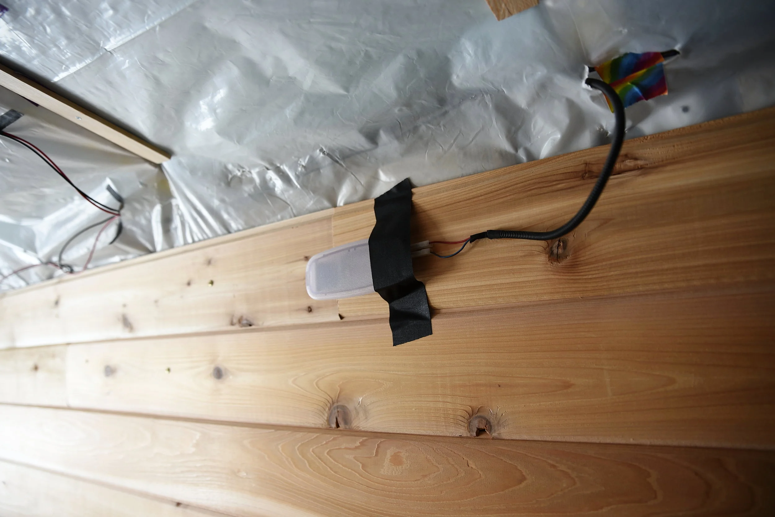 We wanted to keep the dome lights in our van, but they had too thin a profile to be installed in the cedar walls. We put them in the ceiling instead.