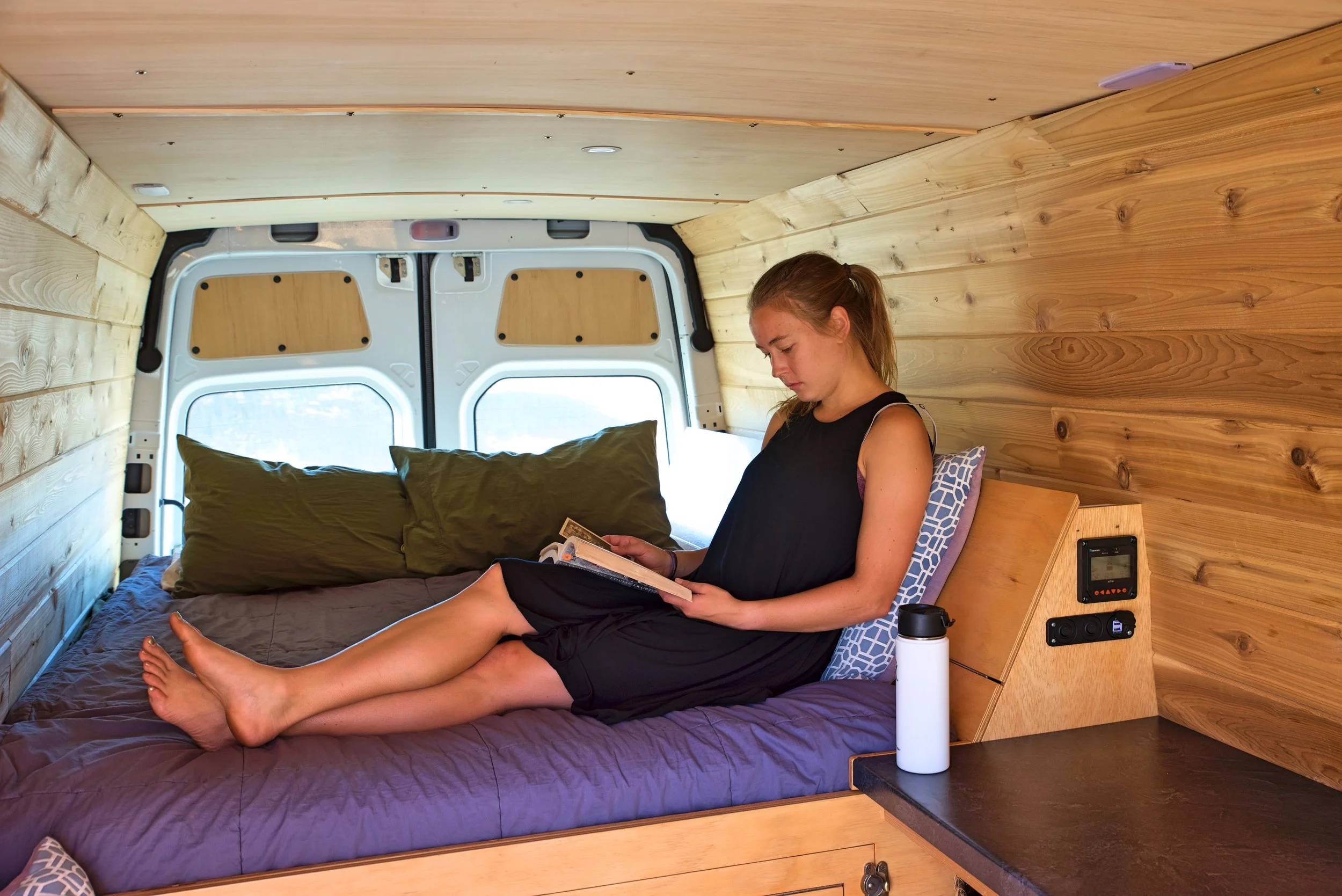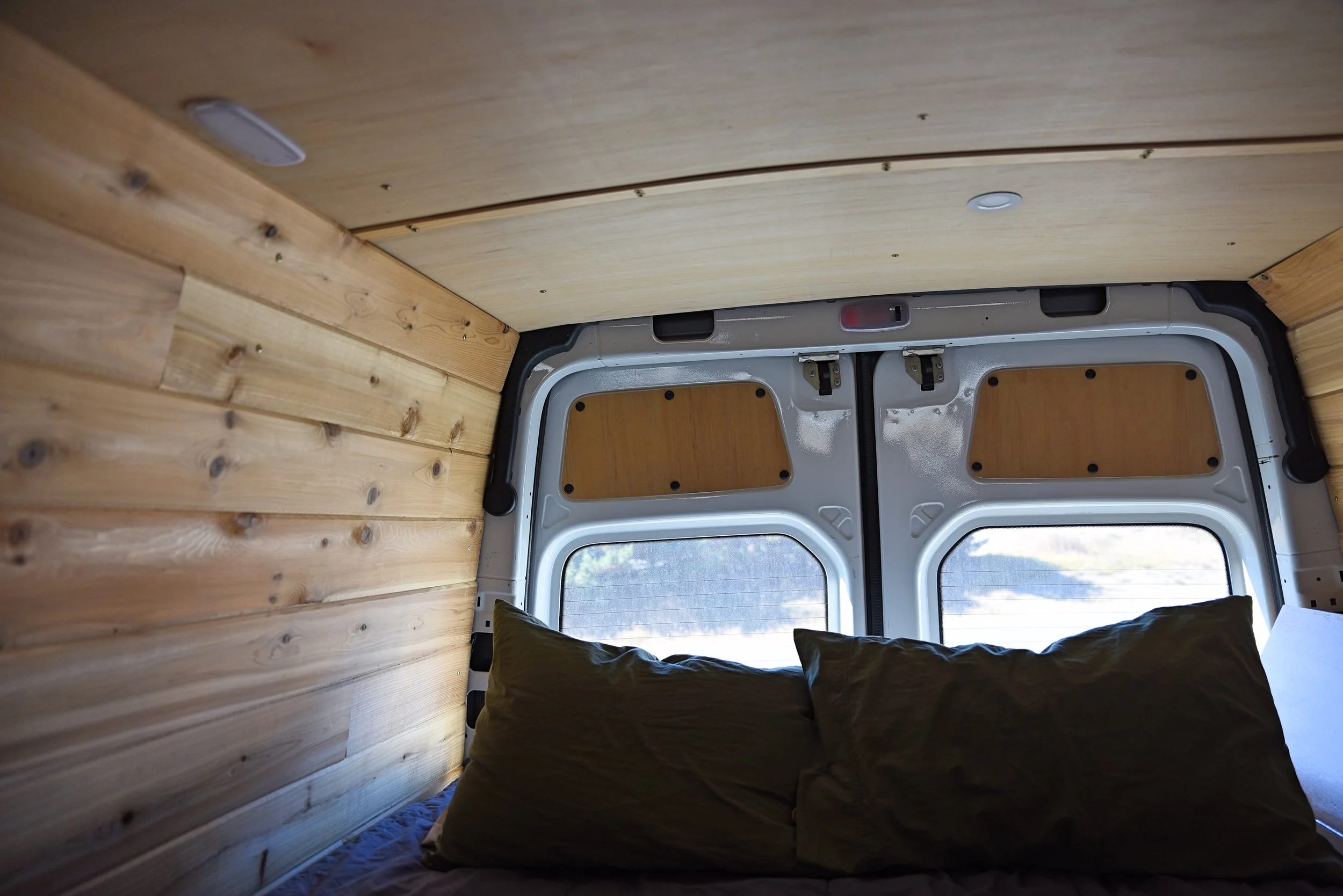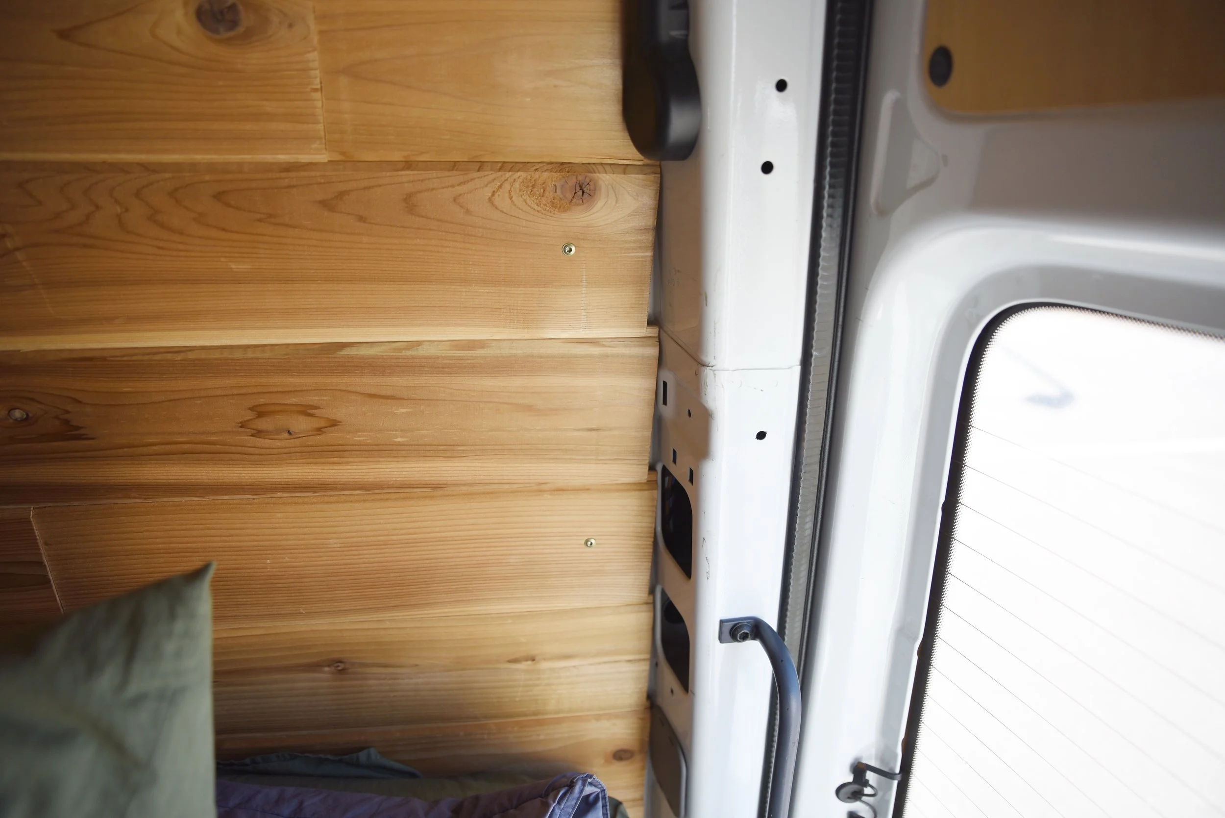 Many van builds start by paneling the entire van from top to bottom early on. For us it made more sense for paneling the walls to be one of the final tasks on our list. Cedar paneling is expensive, so there wasn't any point in putting it under the bed platform or behind our cabinets where in wouldn't be seen. The back of the cabinetry is just finished with a simple 1/4-inch plywood. This helped keep the cabinets square, saved us space, and also meant we didn't have to waste the more expensive cedar.