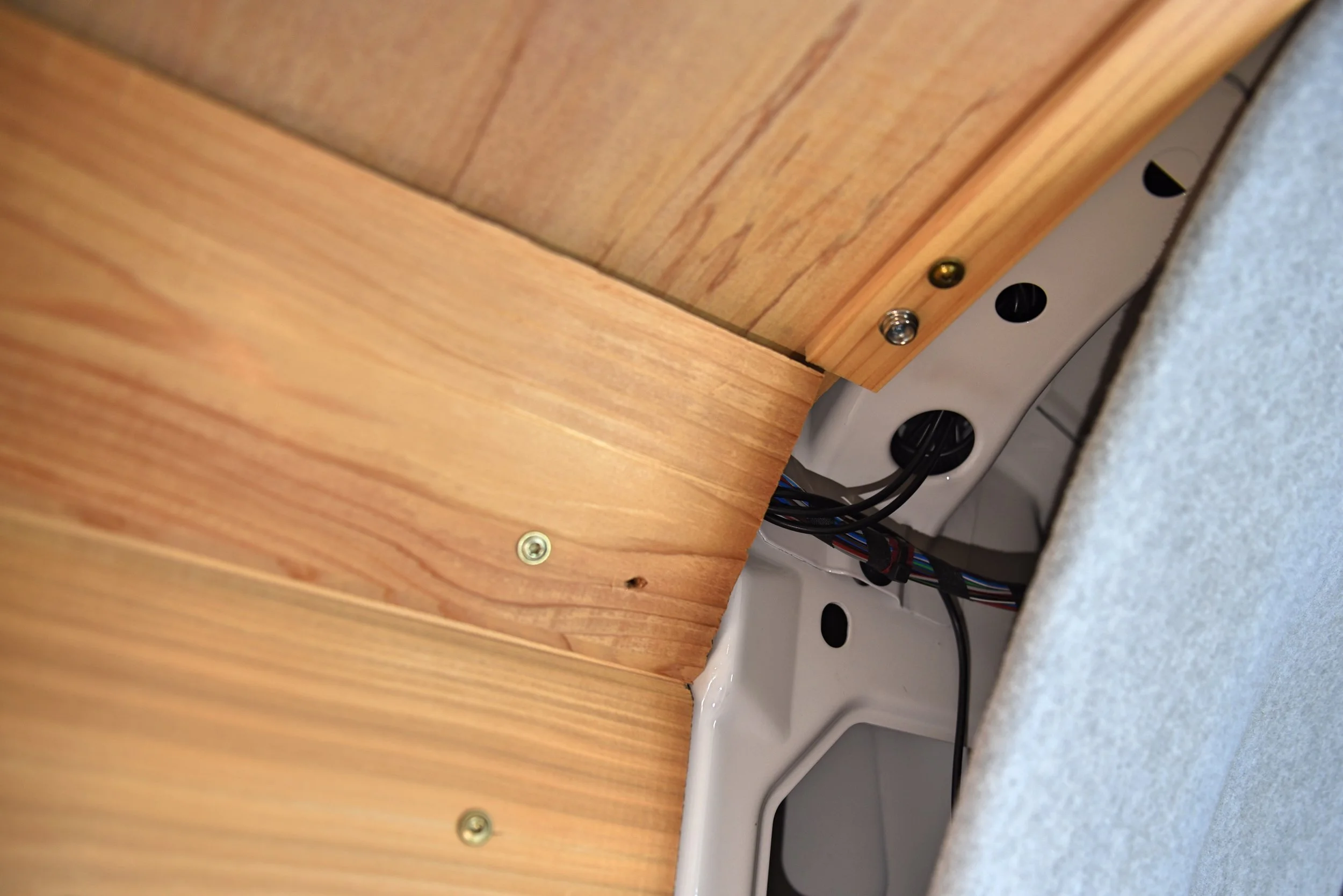 We put many screws into this piece to fasten it, because we didn't want there to be any gaps showing the wire, since the piece is curved. We also like the exposed look of the zinc-coated screws, and they tied the "wire access panel" into the rest of the van.