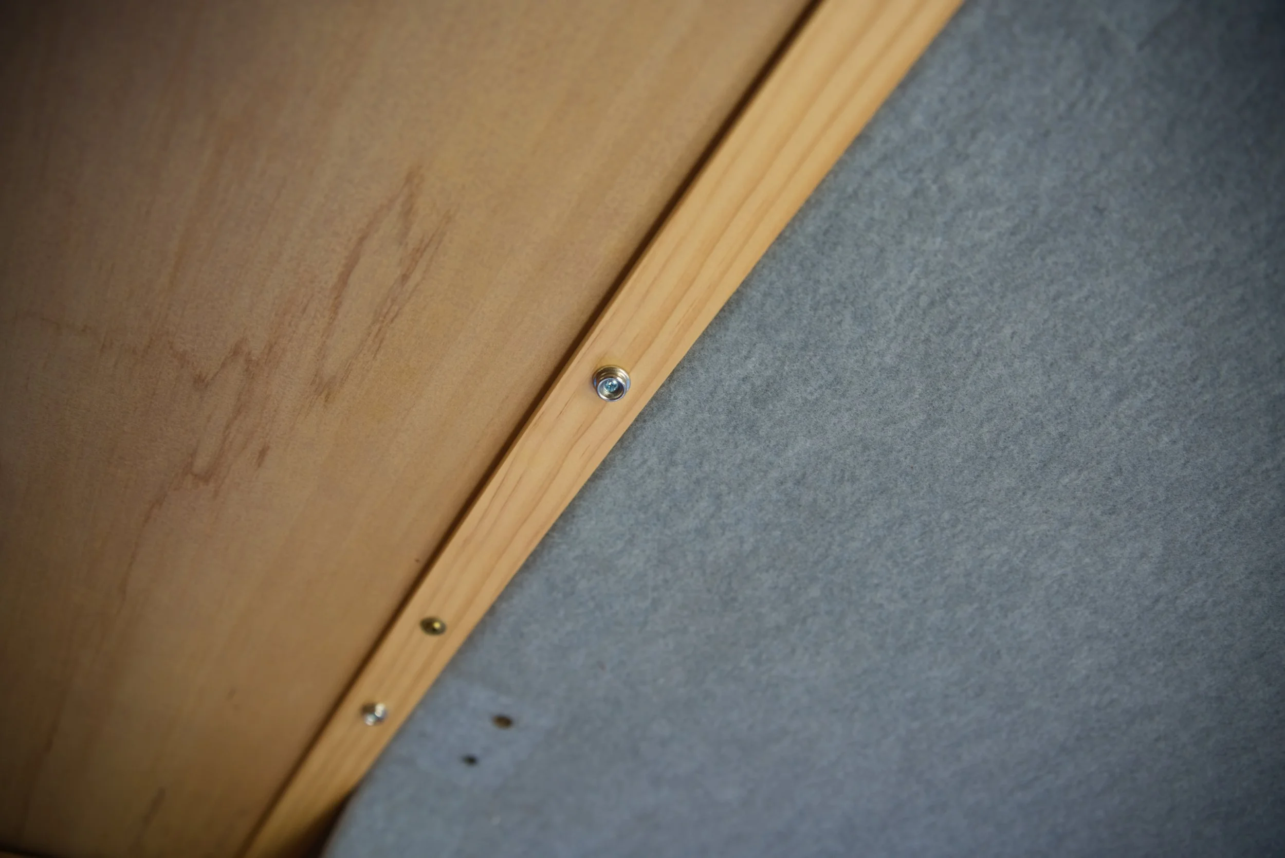 We used self-tapping sheet metal screws, to attach the wood directly to the metal ribs of the van. We picked what we think is an attractive zinc-plated, wafer-head screw that matches the hardware on our cabinets.
