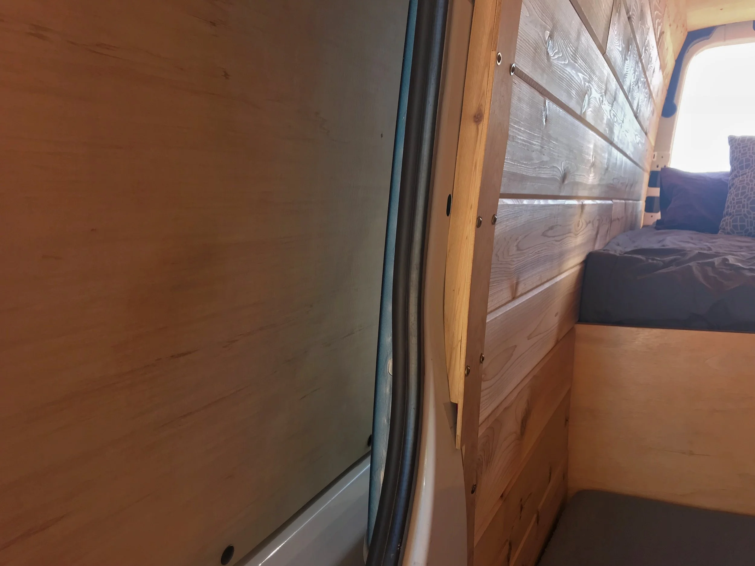 The other benefits of cedar is that weighs less, and it's a better insulator than pine. Cedar has natural oils in it that make it resistant to damage from water or decay, which meant that it would be okay if left unfinished. We wanted to leave the walls unfinished, to reduce provide a contrast with our more glossy bed cabinets and fridge-storage bench. We have no regrets about using cedar. It gives the van a warm atmosphere, and every morning when we boil water to make coffee, we reminded by the fragrant scent of the cedar why we chose it for the inside of our van.